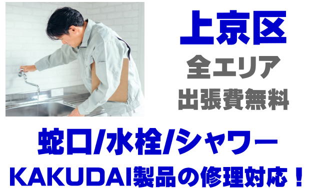 上京区で水栓メーカーKAKUDAIの修理業者をお探しなら当社までお気軽にお問い合わせください。蛇口の水漏れ、シャワーの故障などカクダイ製に関するトラブルなら何でもご相談ください。